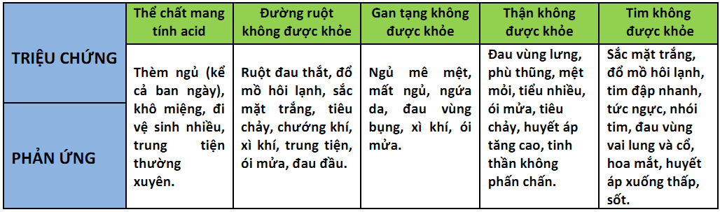 Cơ thể con người vốn mang tính acid nên máu có phần bị vẩn đục, sẽ dẫn đến các cơ quan trong cơ thể phát sinh các loại bệnh biến. Từ đó, việc phải duy trì được tính kiềm của cơ thể là vô cùng quan trọng. Khi mà từ “Thể chất mang tính acid” biến thành “Thể chất mang tính kiềm” là thể chất đang được cải thiện, những độc tố trong cơ thể đang được đào thải ra ngoài, lúc này xuất hiện các loại triệu chứng và phản ứng. Những triệu chứng và phản ứng này sẽ thay đổi theo từng thể chất khác nhau, có tình trạng rất nhẹ, có tình trạng rất nặng, khác nhau theo từng cơ thể mỗi người. Khi phản ứng cường giao cảm dần dần mất hẳn, cả người sẽ cảm nhận sự nhẹ nhàng thoải mái, hơn nữa rất có tinh thần.